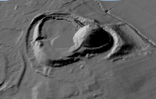 Picture: 3D visualisation of LiDAR 2m DTM dataset for Tickhill Castle Motte and Bailey. Built by Roger de Busli in the 12th century.